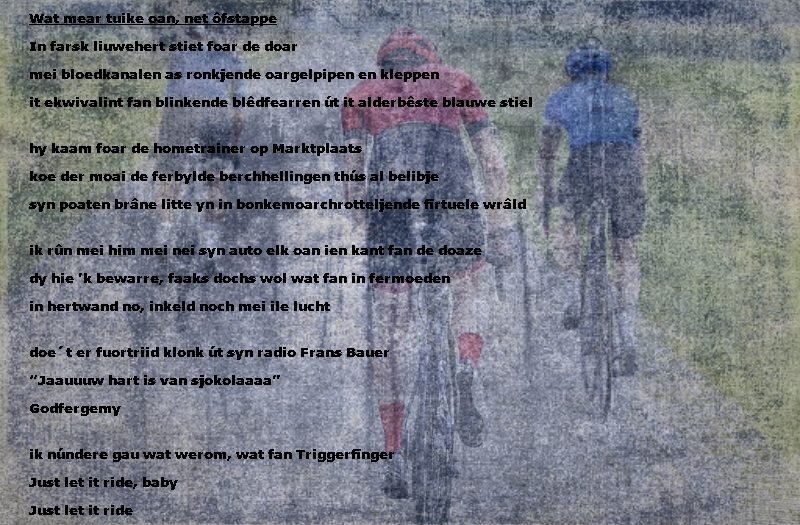 Wat mear tuike oan, net ôfstappe In farsk liuwehert stiet foar de doar mei bloedkanalen as ronkjende oargelpipen en kleppen it ekwivalint fan blinkende blêdfearren út it alderbêste blauwe stiel hy kaam foar de hometrainer op Marktplaats koe der moai de ferbylde berchhellingen thús al belibje syn poaten brâne litte yn in bonkemoarchrotteljende firtuele wrâld ik rûn mei him mei nei syn auto elk oan ien kant fan de doaze dy hie 'k bewarre, faaks dochs wol wat fan in fermoeden in hertwand no, inkeld noch mei ile lucht doe´t er fuortriid klonk út syn radio Frans Bauer "Jaauuuw hart is van sjokolaaaa" Godfergemy ik núndere gau wat werom, wat fan Triggerfinger Just let it ride, baby Just let it ride © Edwin de Groot