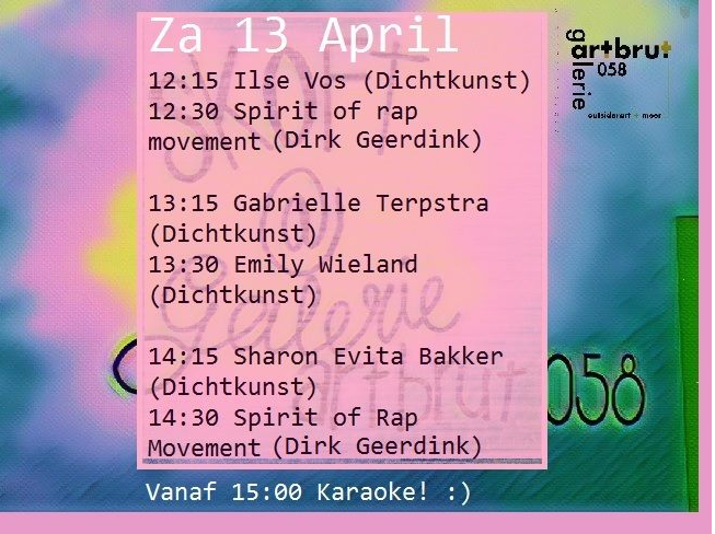 ‘Zaterdag kun je ook even skoft houden op de galerie! Vanaf 12:00 tot +/-16:30 is er een afwisselend programma met live muziek, poëzie en eindigen de dag met karaoke.’