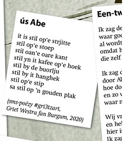 It Frysk Deiblêd stiet, lykas oaren, stil by de hûndertste bertedei fan Abe Lenstra en sochten om dy reden fyftjin gedichten út. Ien fan de gedichten kaam fan Griet Westra, ús Abe.