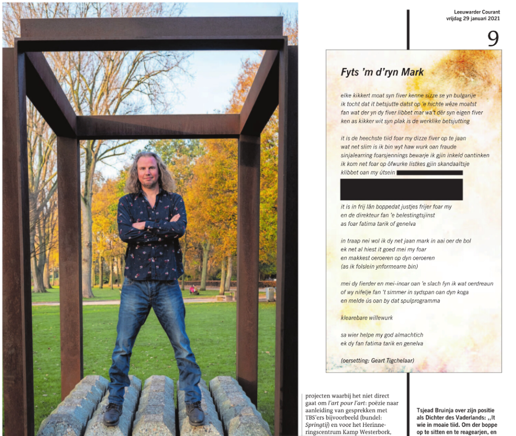Yn de Ljouwerter Krante fan 29 jannewaris stiet in fraachpetear mei Tsead Bruinja oer syn twa jier as Dichter des Vaderlands. Dêrby stiet ék de Fryske oersetting fan syn lêste gedicht, Fyts ‘m d’ryn Mark, publisearre op RIXT., oersetten troch Geart Tigchelaar.