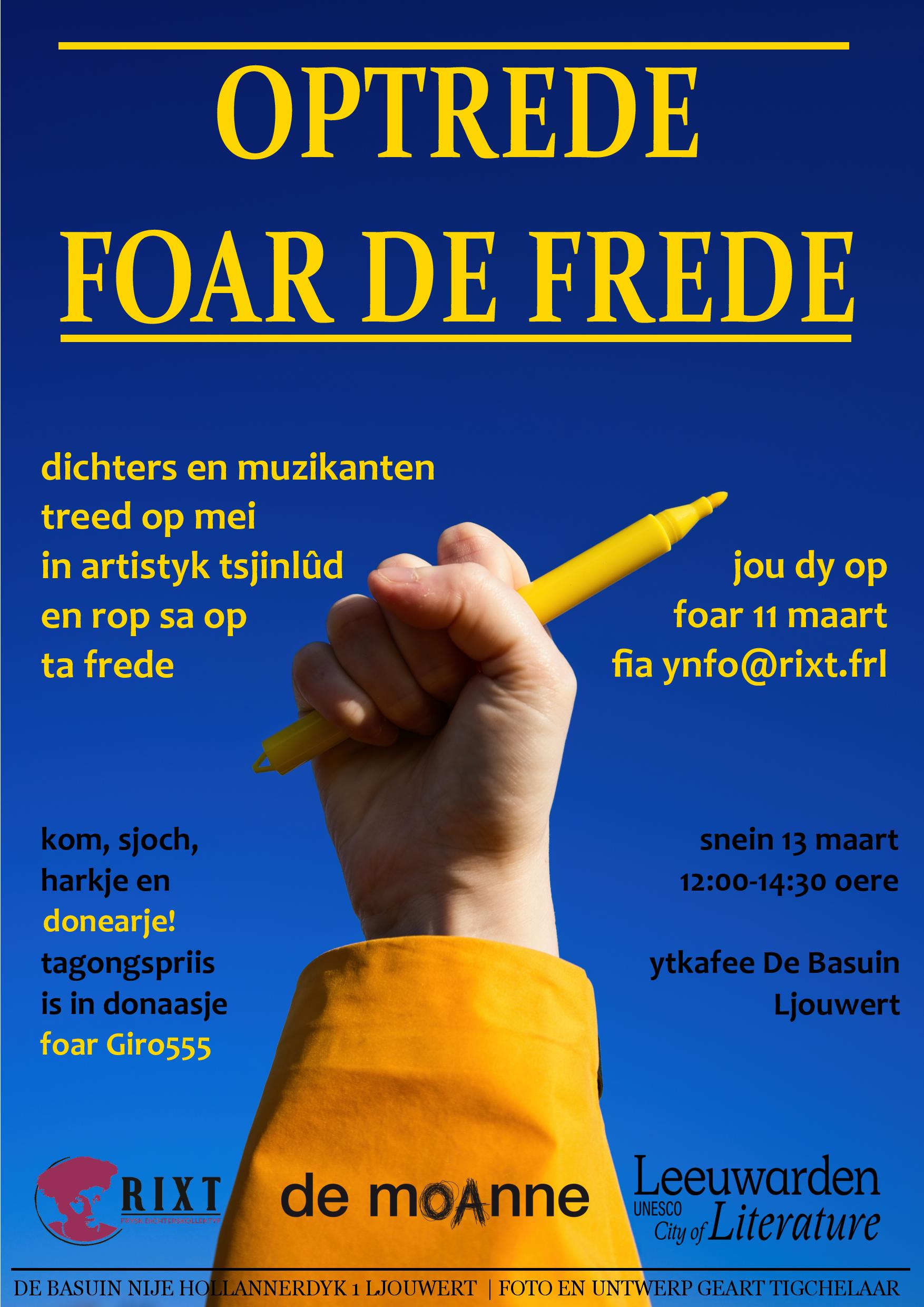Dichterskollektyf RIXT, kultureel opinyblêd De Moanne en City of Literature Ljouwert organisearje kommende snein 13 maart in kulturele manifestaasje foar de frede.
