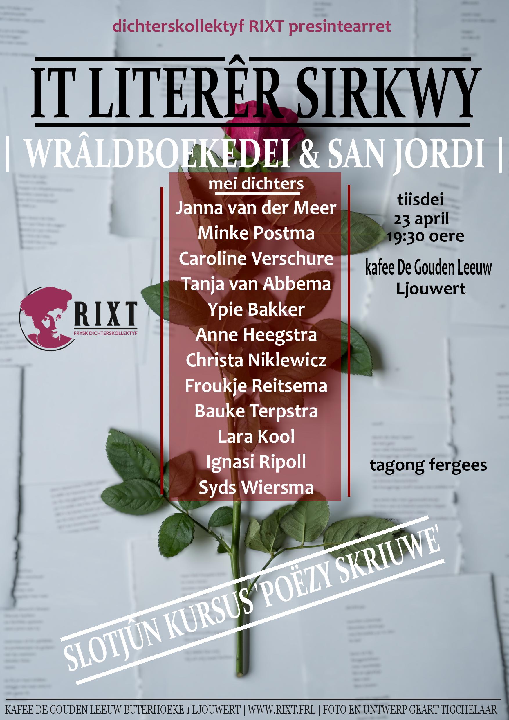 Tiisdeitejûn 23 april, op Wrâldboekedei, organisearret Dichterskollektyf RIXT wer in Literêr Sirkwy. Dizze kear by Tresoar yn kafee De Gouden Leeuw.