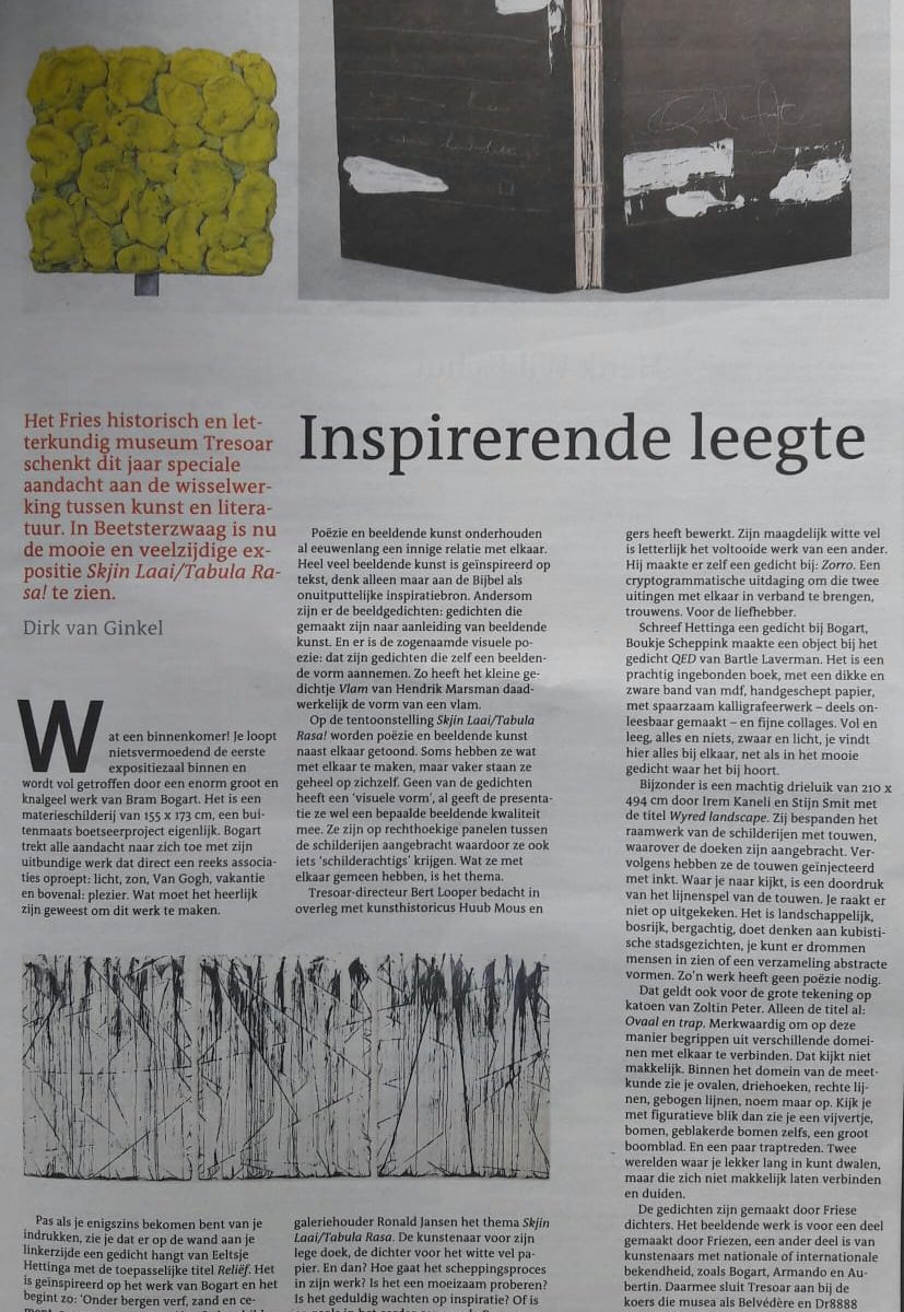 ‘Yn 1974 skreau Steven de Jong yn it tiidskrift Trotwaer it gedicht ‘Tabula Rasa’, mei de begjinrigel ‘de stilte falt yn wurden op it wyt papier’. Yn 2018 skriuwt Eeltsje Hettinga, Dichter fan Fryslân, by de útstalling Skjin Laai/Tabula Rasa in gedicht mei de slotrigel ‘sa’t altemets út it neat wei skepping syn flecht fynt’. Twa prachtige rigels dy’t it wûnder en it riedsel fan ‘skepping’ ûnder wurden bringe. De dichter of keunstner sit foar syn wite papier en ynienen falle der wurden en bylden. Wêr komme dy wie? Ut de leechte? Samar? Is it hieltyd wer begjinne mei in skjin laai? Of is it no krekt út de follens wei fan tûzenen jierren lang opsteapele ideeën, teksten en bylden en besiket de skriuwer/keunstner om wer leechte en stilte te meitsjen?’